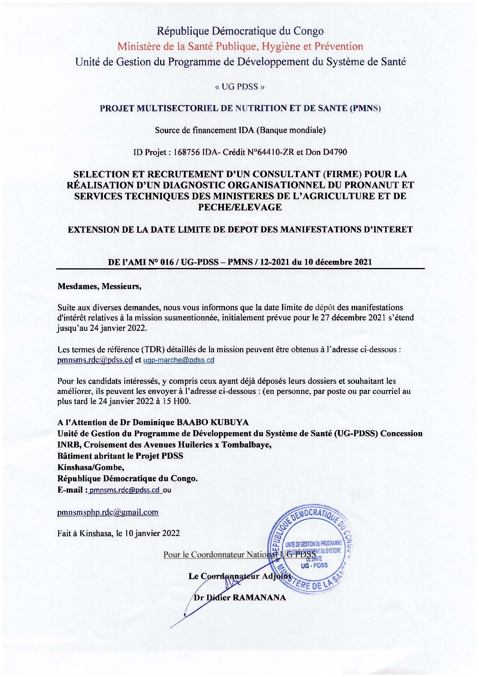 Extension de la date Limite de dépôt d’AMI N°016-UG PDSS-PMNS-12-2021 : Sélection et recrutement d’un consultant (Forme) pour la réalisation d’un Diagnostic organisationnel du PRONANUT et Services Techniques des Ministères de l’Agriculture et de Peche/Elevage