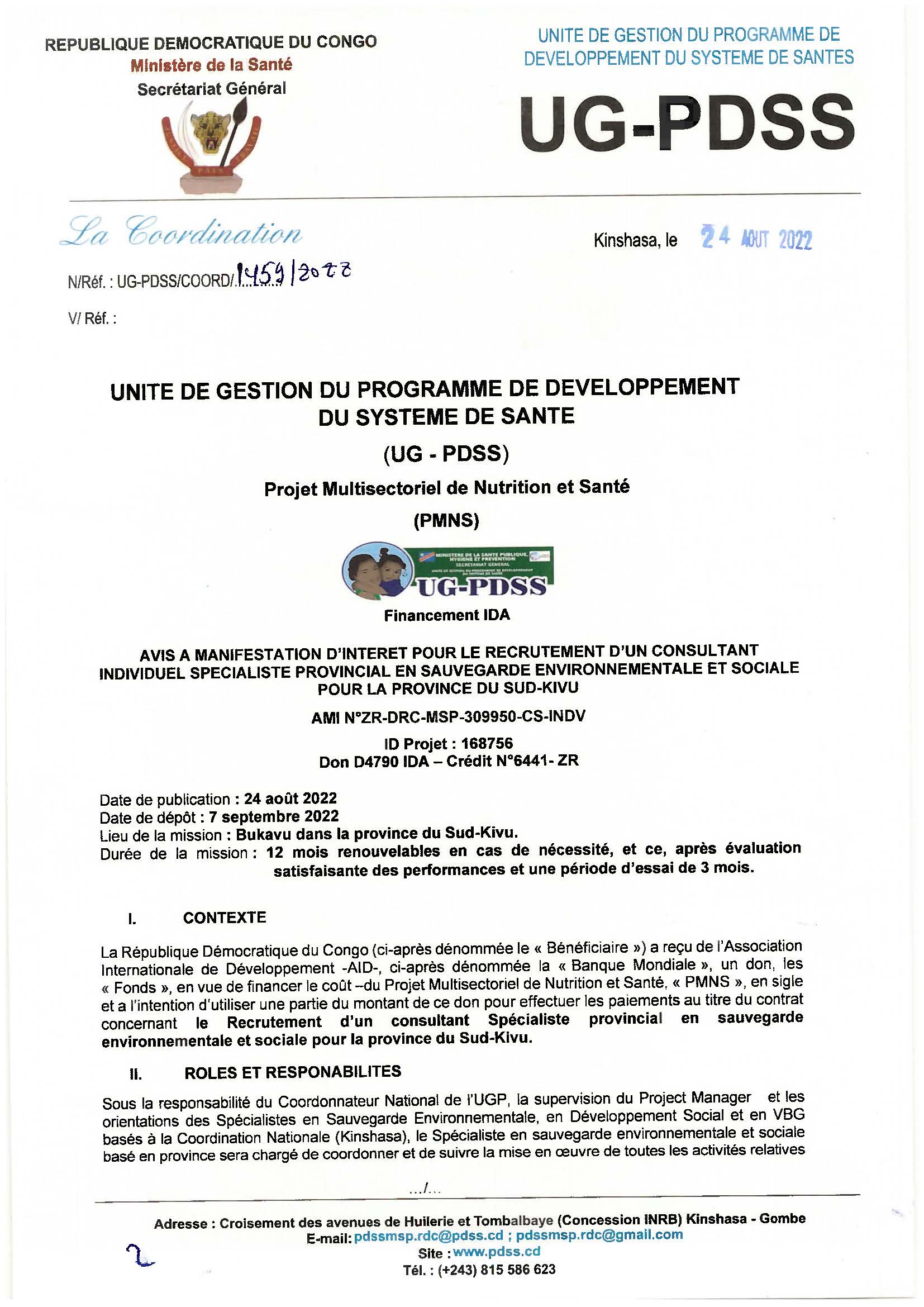 Avis à Manifestation d’intérêt pour le recrutement d’un Consultant individuel Spécialiste en sauvegarde Environnementale et Sociale pour la province du Sud-Kivu