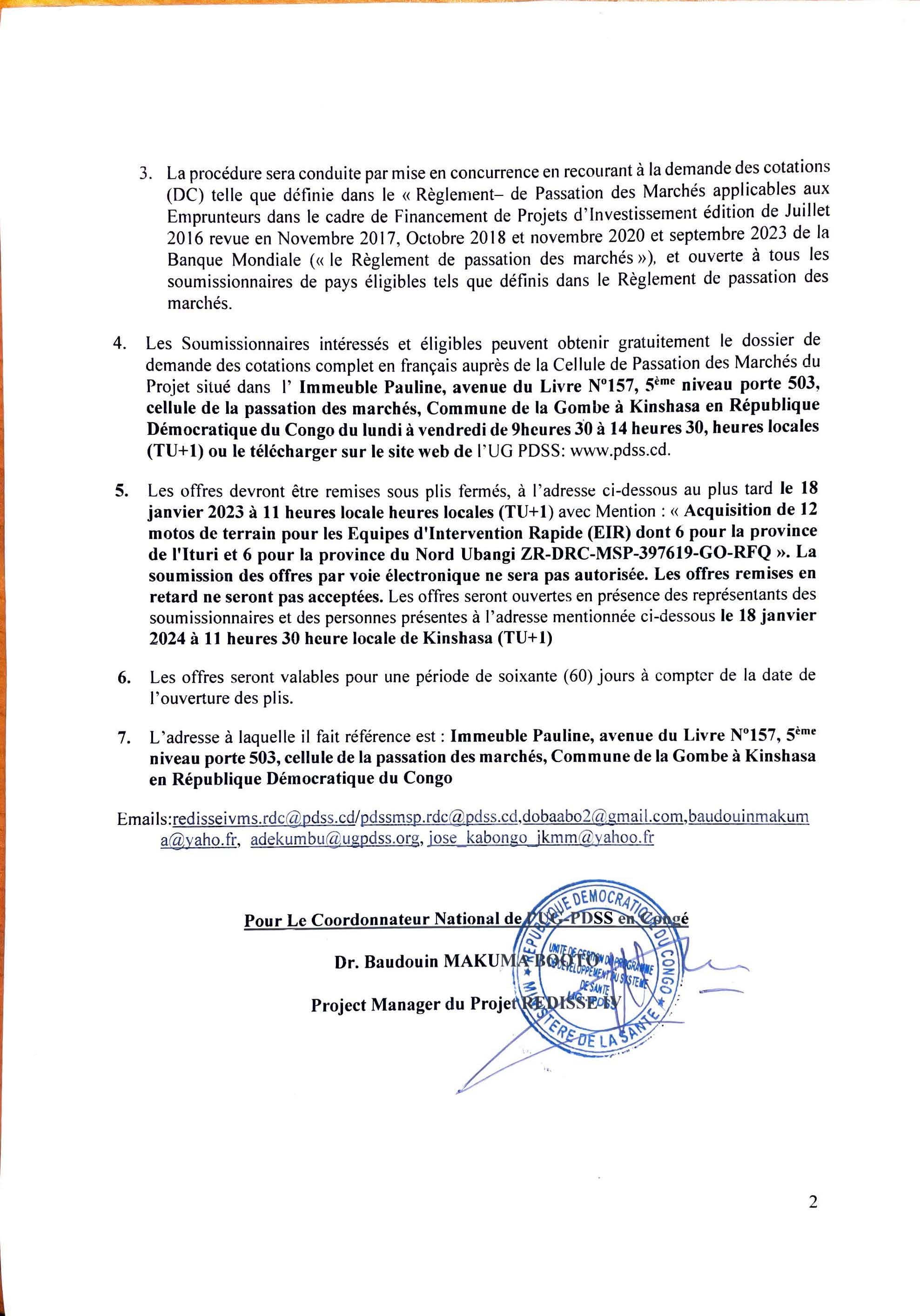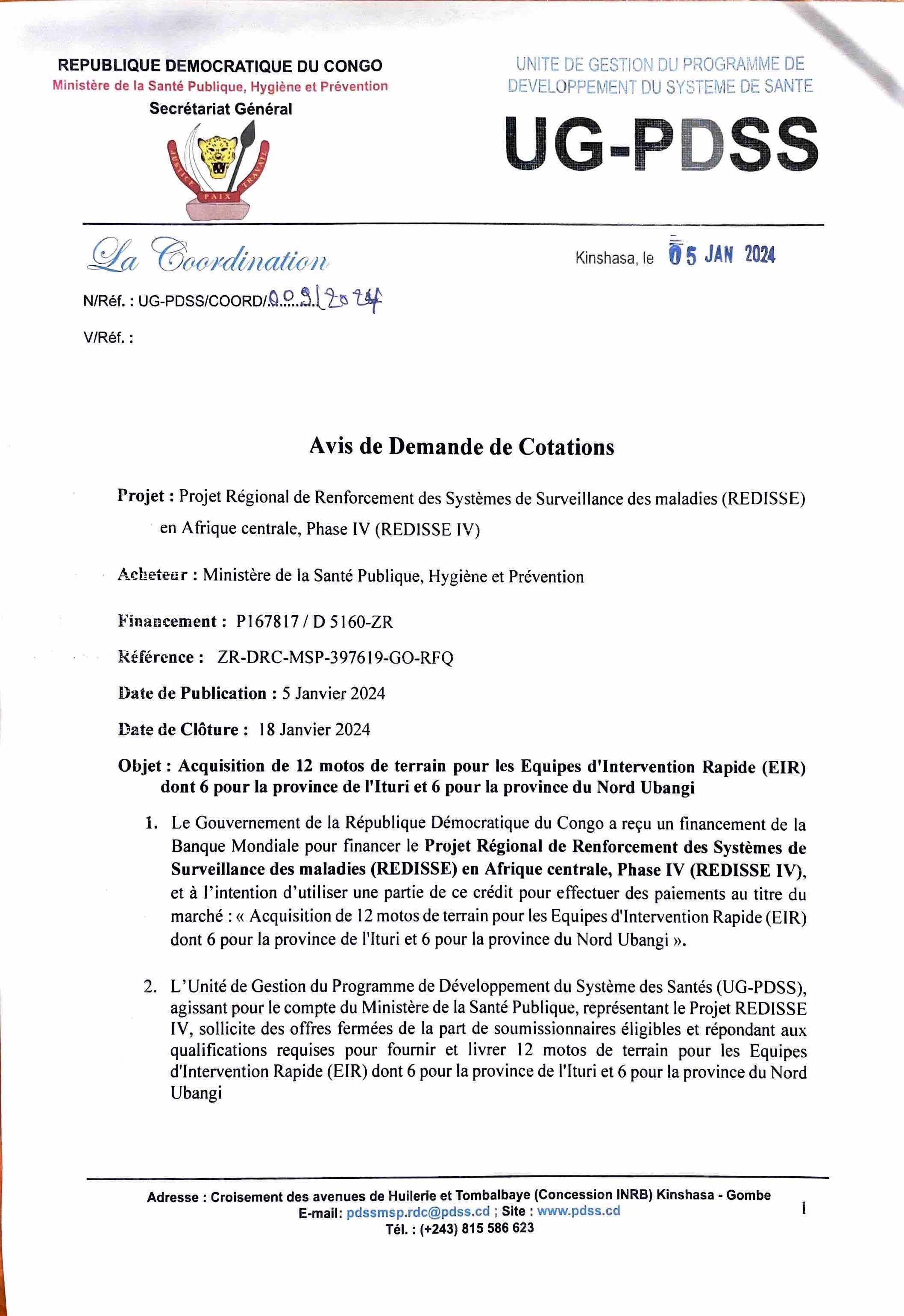 Acquisition de 12 motos de terrain pour les équipes d’intervention rapide (EIR) dont 6 pour la province de l’Ituri et 6 pour la province du Nord Ubangi
