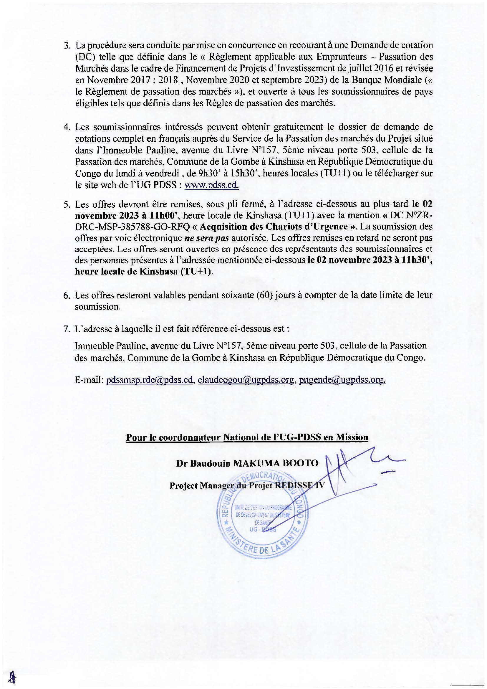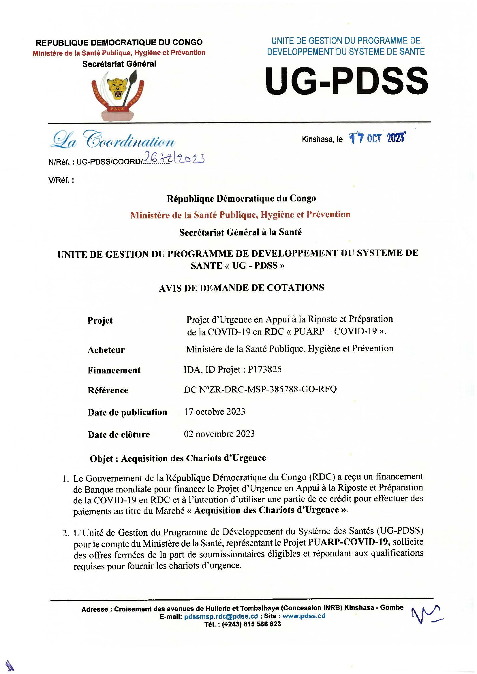 By Guylain Mafuta Acquisition des chariots d’urgence RDC Publié il y a 2 ans Les candidatures sont actuellement fermées. Site ugpdss UG-PDSS - PUARP COVID-19 Cliquer ici pour télécharger la demande de cotation (DC) No Comments 17 octobre 2023