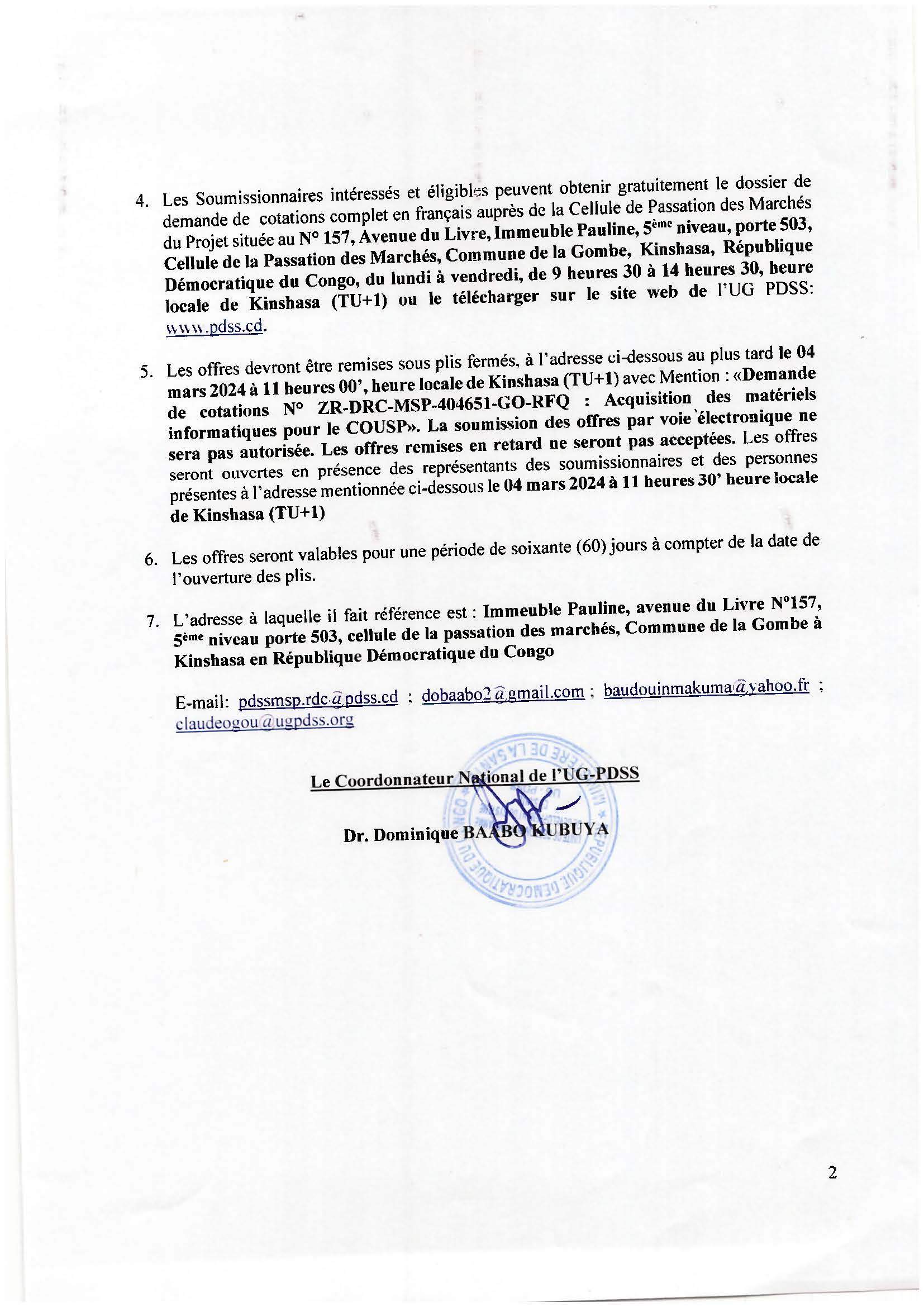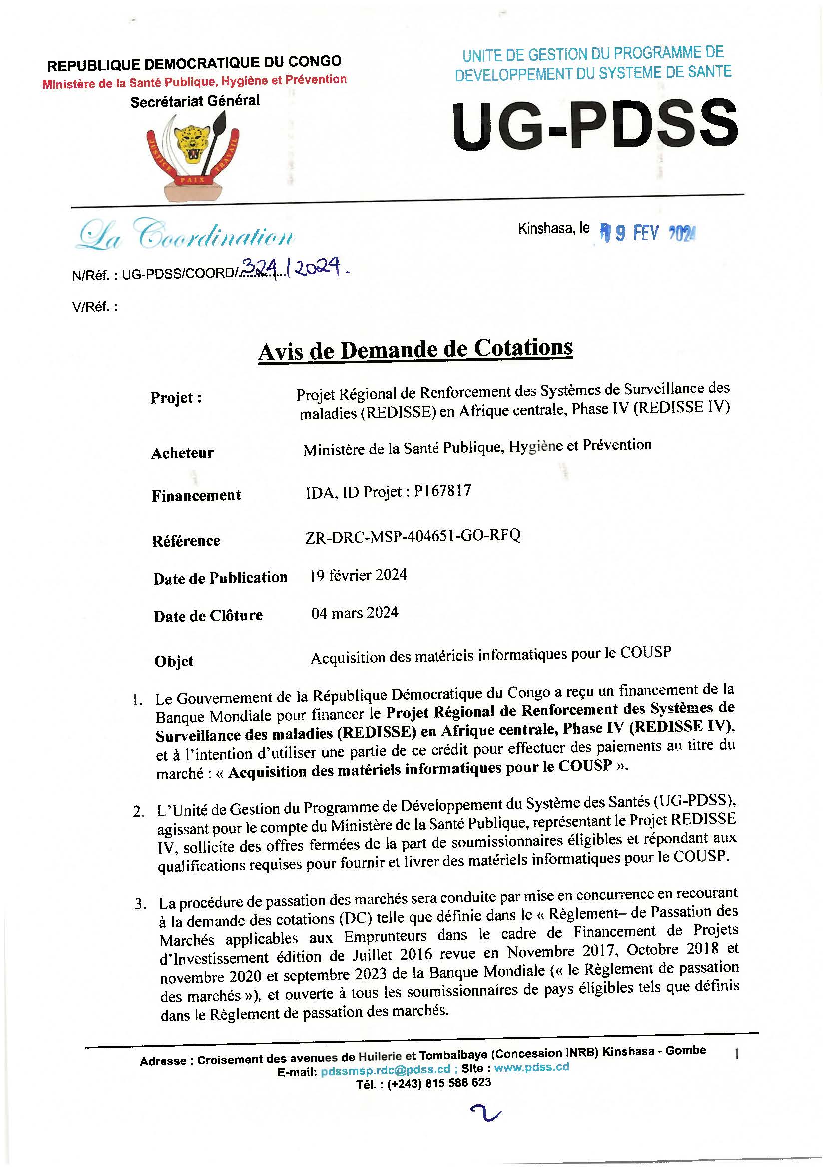 By Guylain Mafuta Acquisition des matériels informatiques pour le COUSP RDC Publié il y a 2 ans Les candidatures sont actuellement fermées. Site ugpdss UG-PDSS - REDISSE IV Cliquer ici pour télécharger la demande de cotation (DC) No Comments 19 février 2024