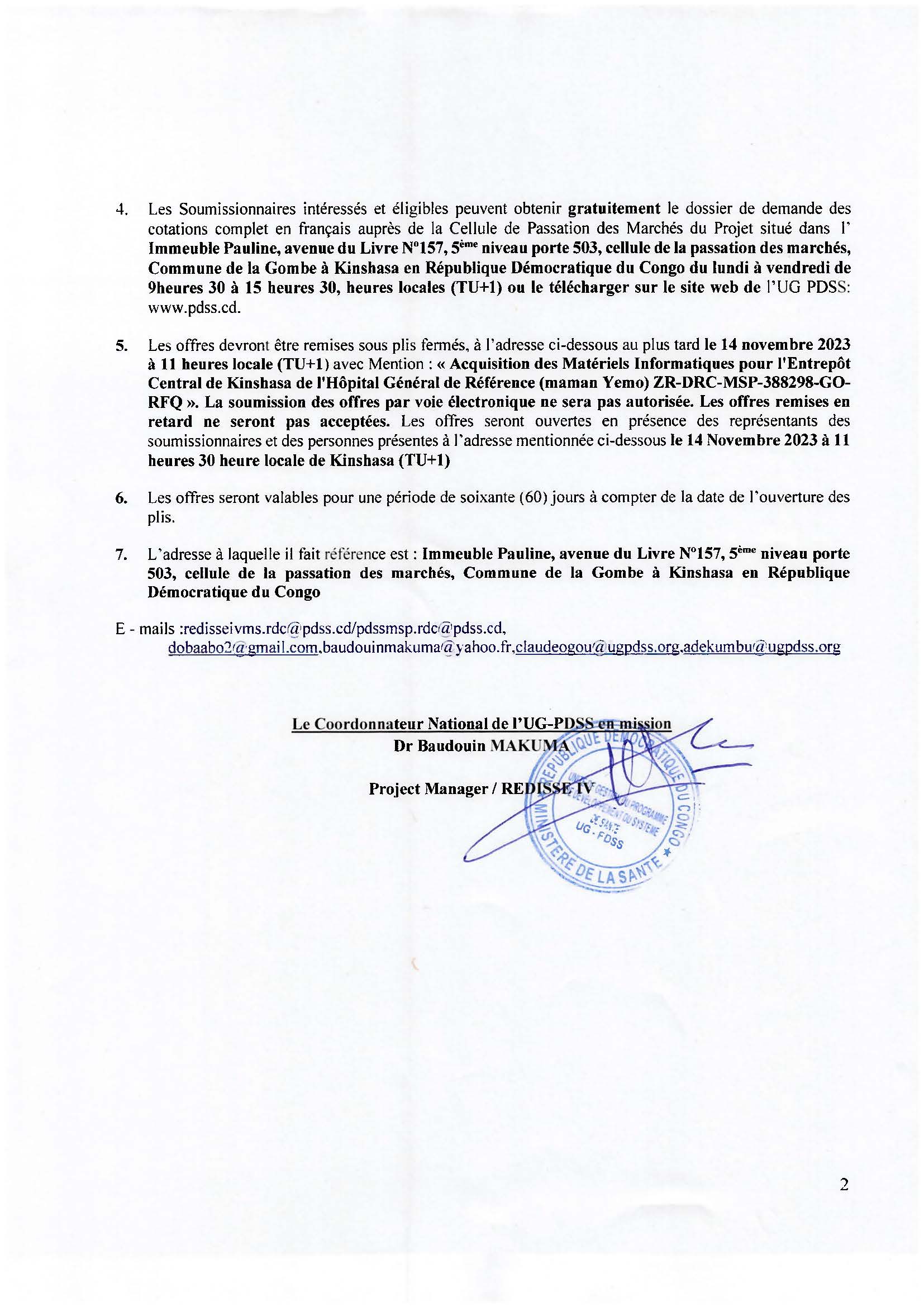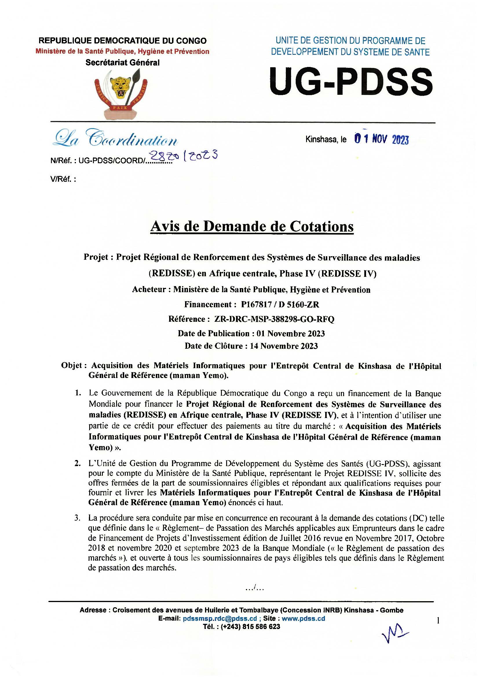 By Guylain Mafuta Acquisition des matériels informatiques pour l’Entrepôt central de Kinshasa de l’Hôpital Général de Référence Maman Yemo RDC Publié il y a 2 ans Les candidatures sont actuellement fermées. Site ugpdss UG-PDSS - REDISSE IV Cliquer ici pour télécharger la demande de cotation (DC) au format PDF Cliquer ici pour télécharger la demande de cotation (DC) au format DOCX No Comments 1 novembre 2023