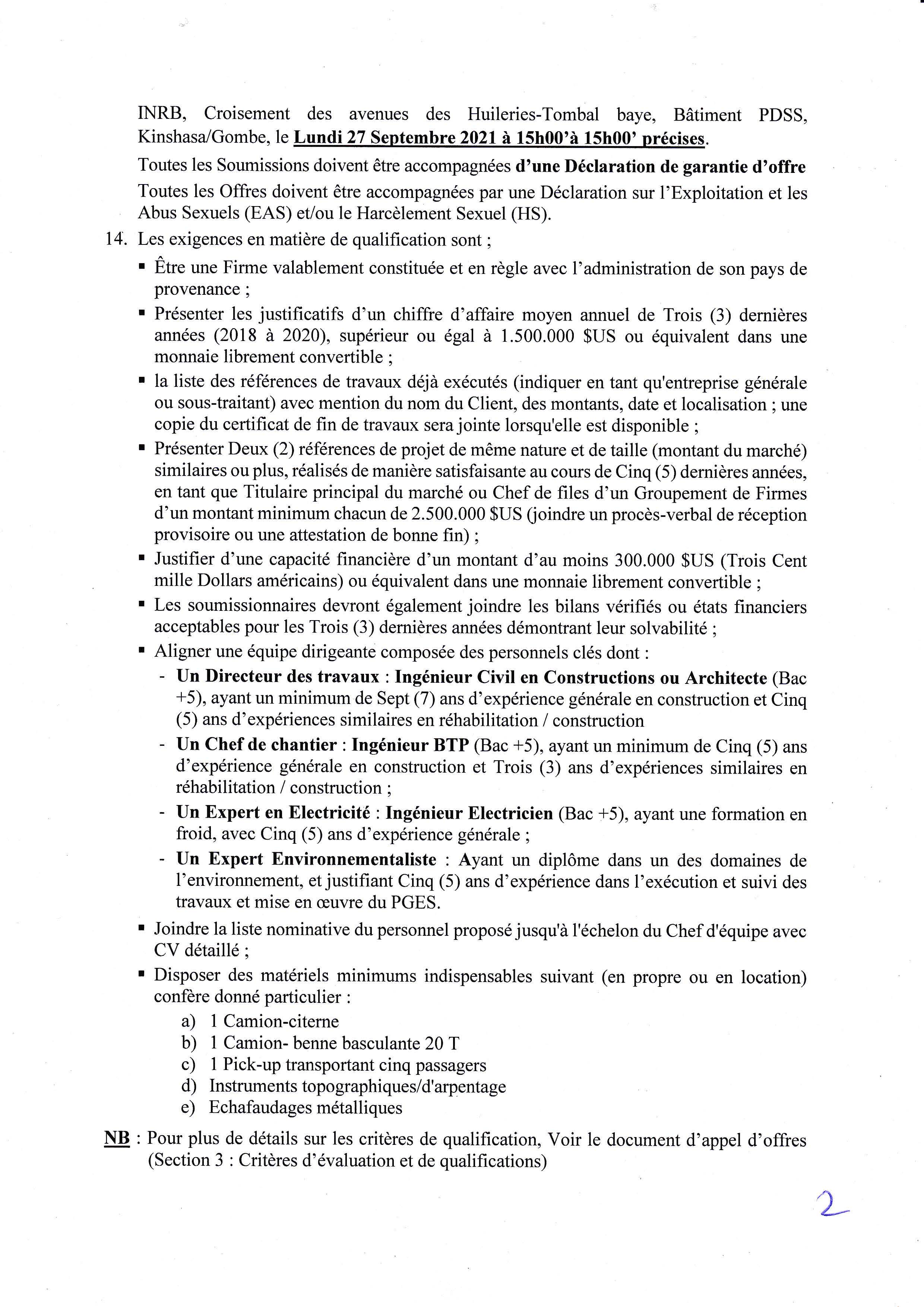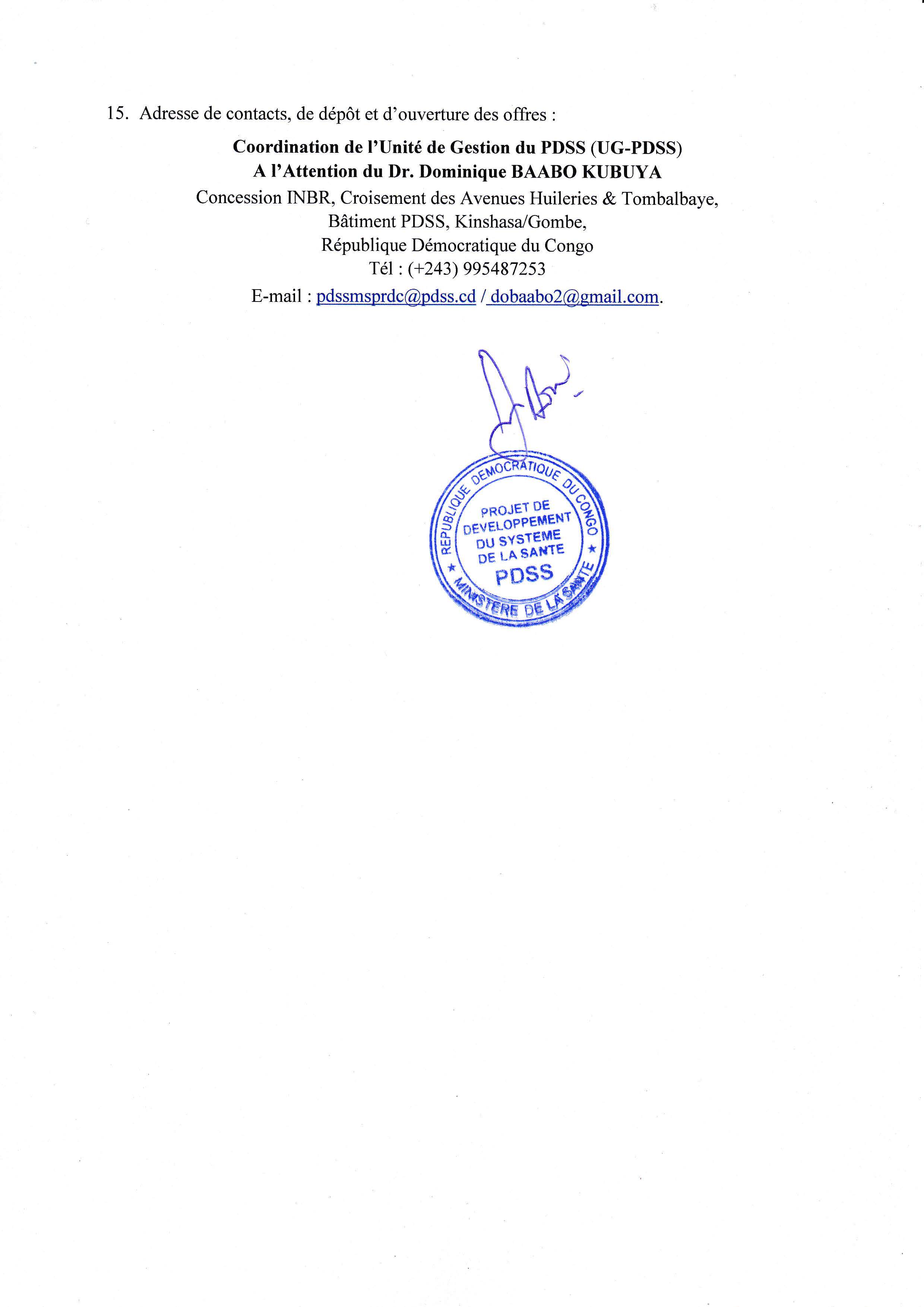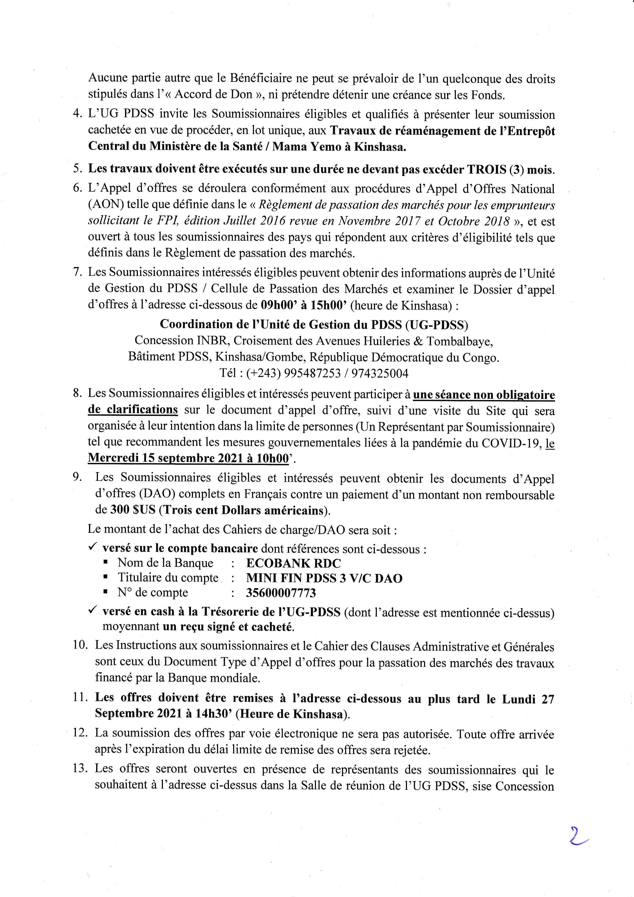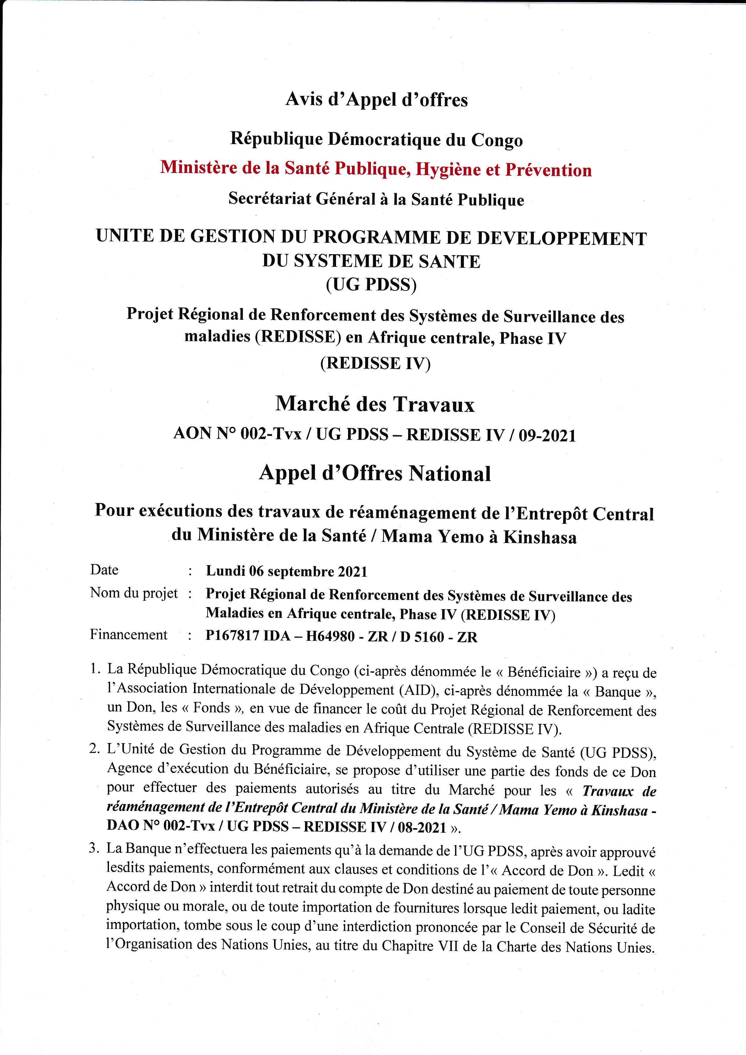 By Guylain Mafuta Appel d’offres National pour Exécutions des travaux de réaménagement de l’Entrepôt Central du Ministère de la Santé / Mama Yemo à Kinshasa RDC Publié il y a 4 ans Les candidatures sont actuellement fermées. Site ugpdss UG PDSS - REDISSE IV No Comments 6 septembre 2021