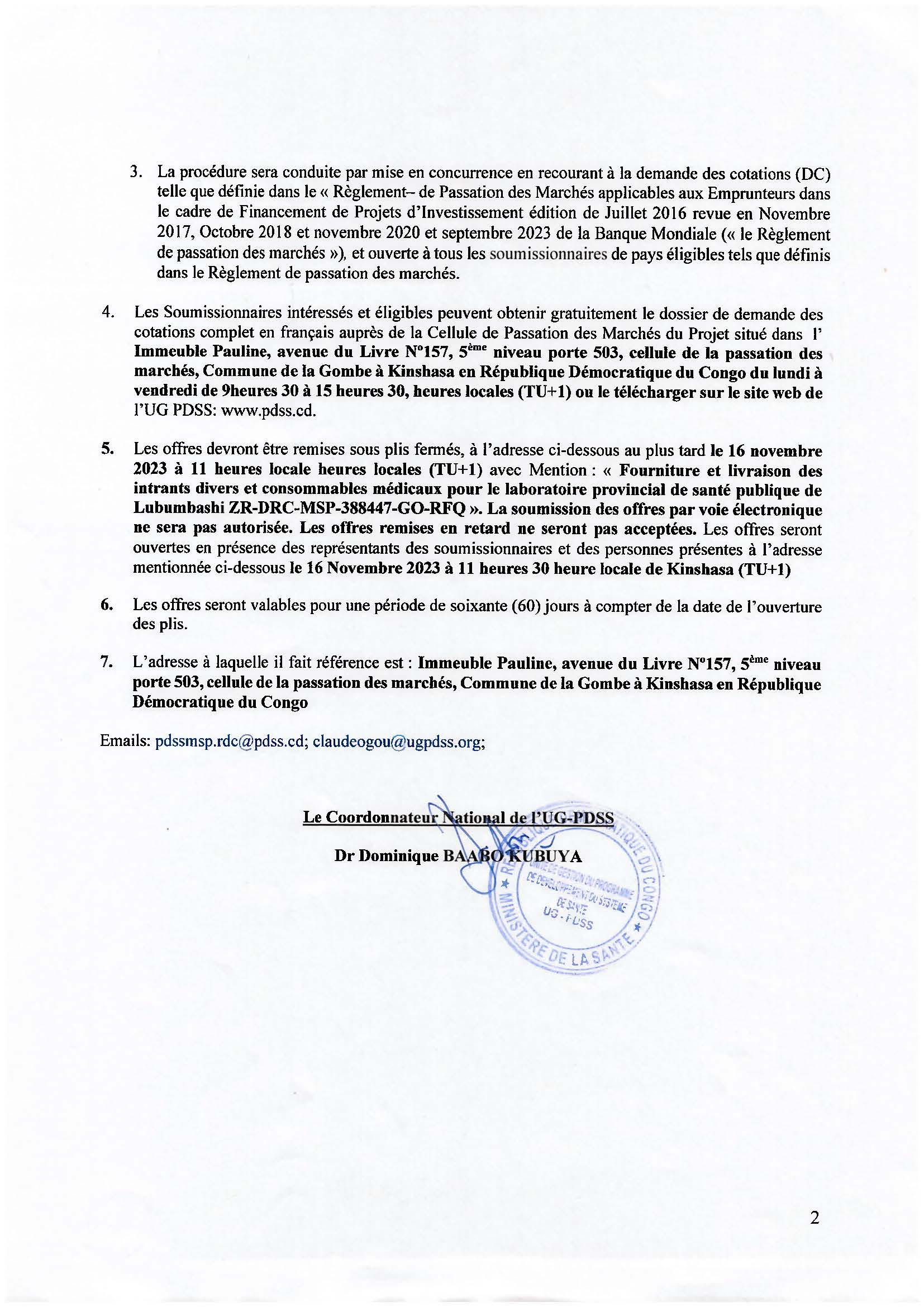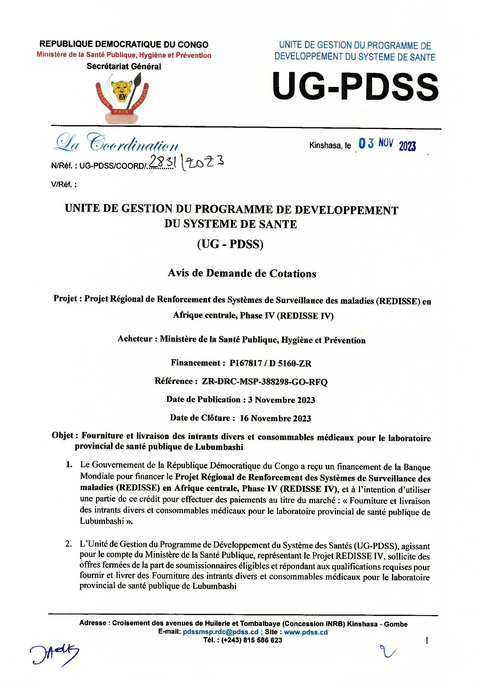 By Guylain Mafuta Fourniture et livraison des intrants divers et consommables médicaux pour le laboratoire provincial de santé publique de Lubumbashi RDC Publié il y a 2 ans Les candidatures sont actuellement fermées. Site ugpdss UG-PDSS - REDISSE IV Cliquer ici pour télécharger la demande de cotation (DC) au format PDF Cliquer ici pour télécharger la demande de cotation (DC) au format DOCX No Comments 3 novembre 2023