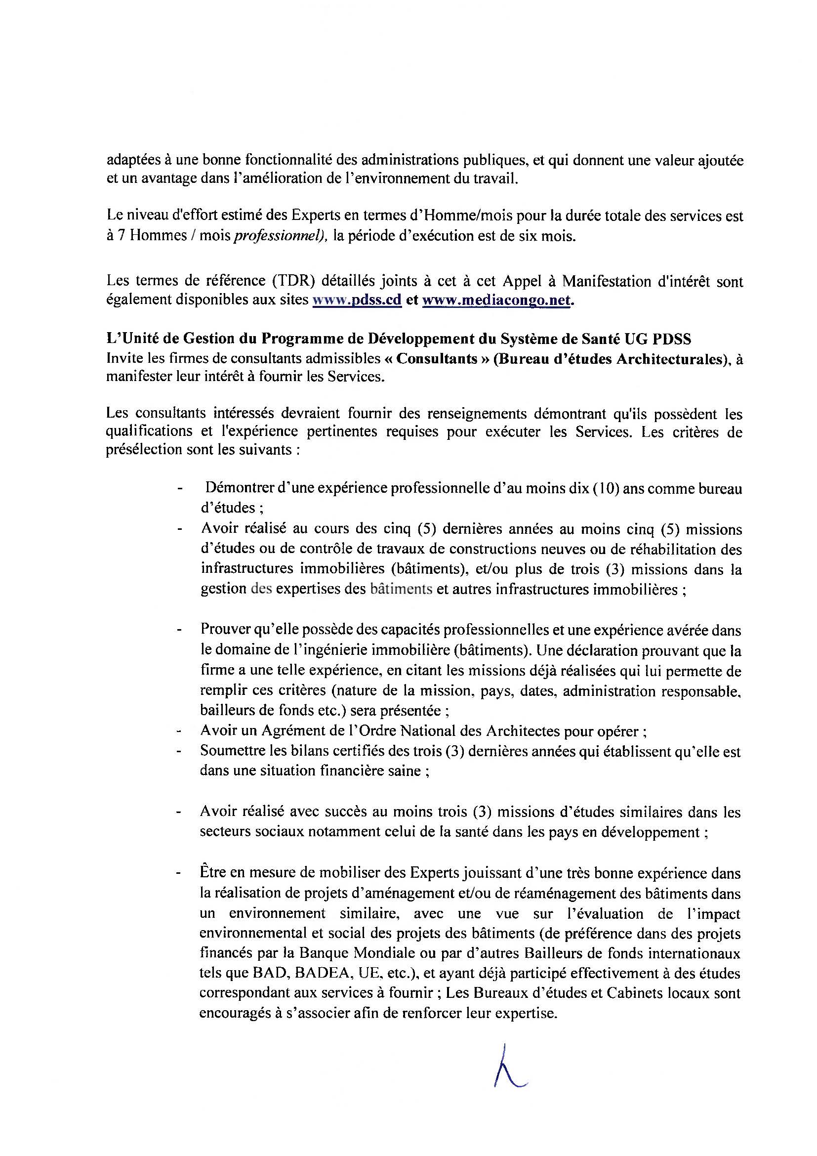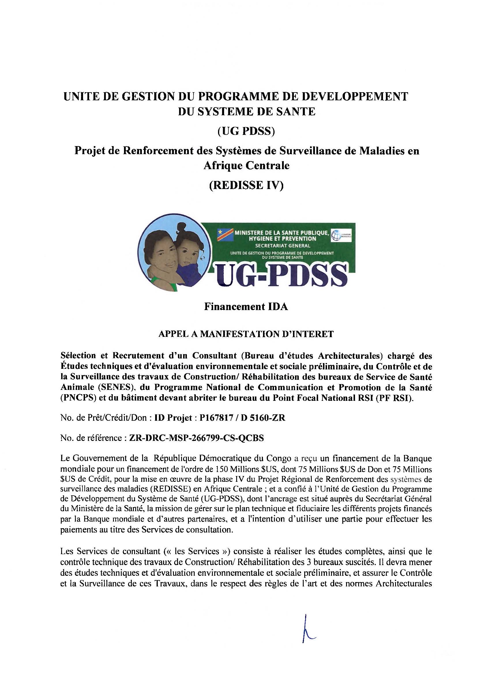 Selection et Recrutement d’un Consultant (Bureau d’études Architecturales) chargé des Etudes technique et d’évaluation environnementale et sociale préliminaire, du Contrôle et de la Surveillance des Travaux de Construction / Réhabilitation des bureaux de Service de Santé Animale (SENES), du Programme National de Communication et Promotion de la Santé (PNCPS) et du bâtiment devant abriter le bureau du Point Focal National RSI (PF RSI)