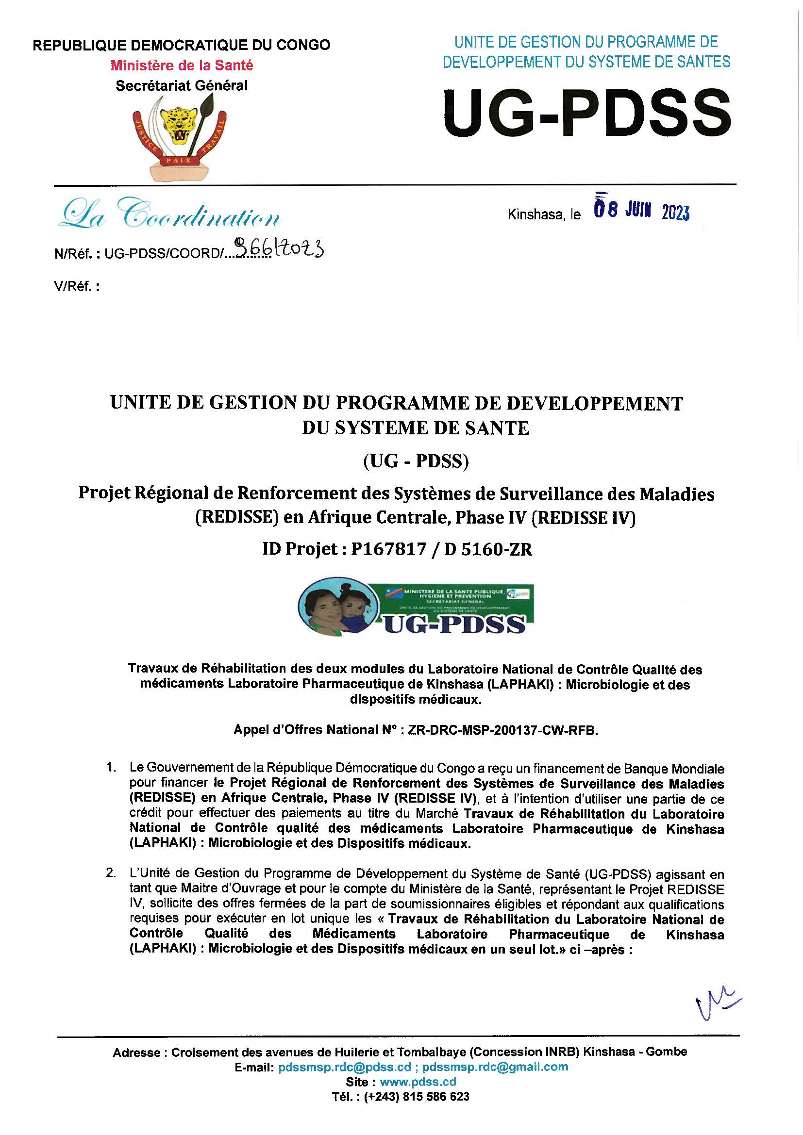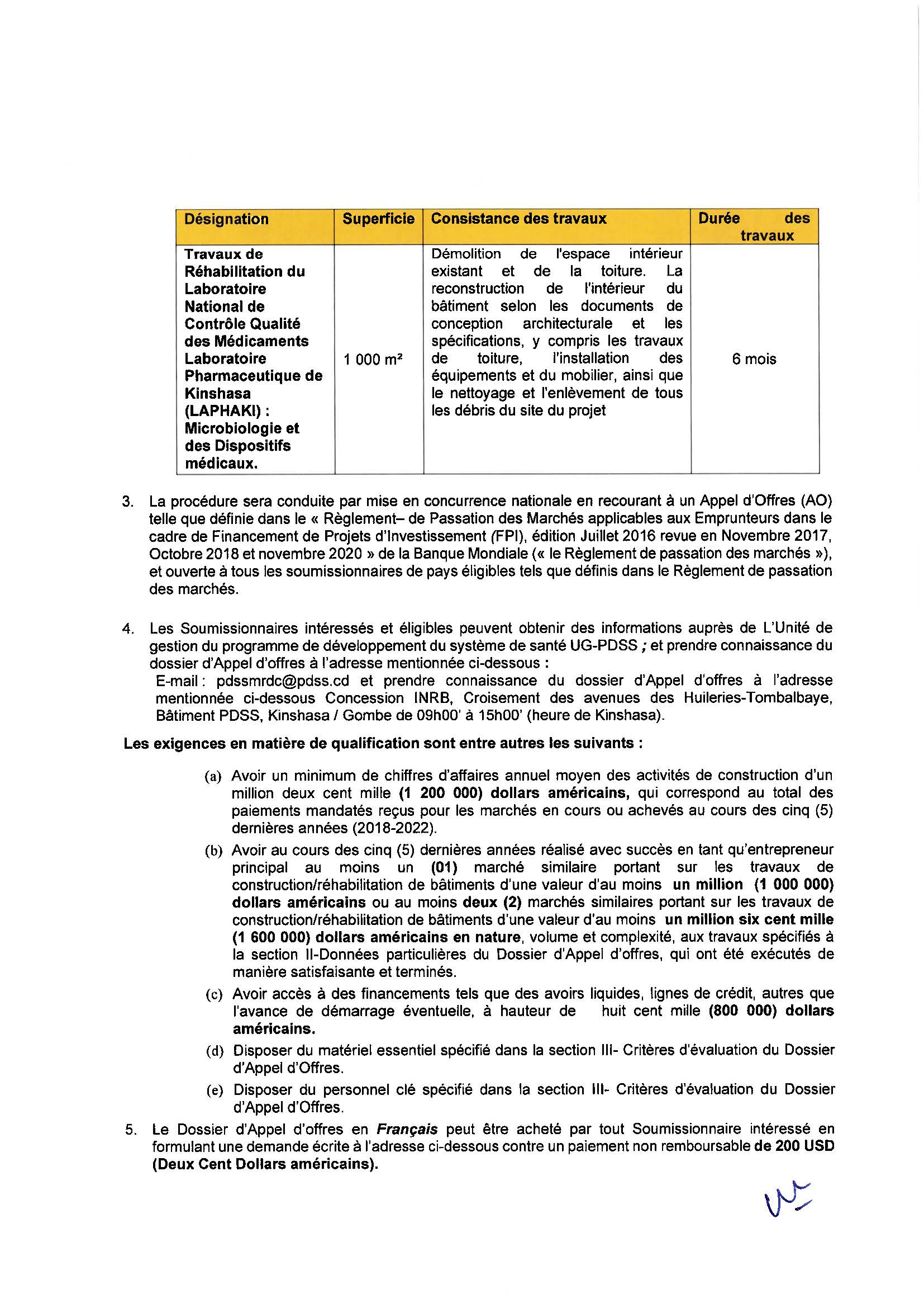 Travaux de Réhabilitation des deux modules du Laboratoire National de Contrôle Qualité des médicaments Laboratoire Pharmaceutique de Kinshasa (LAPHAKI) : Microbiologie et des dispositifs médicaux Travaux de Réhabilitation des deux modules du Laboratoire National de Contrôle Qualité des médicaments Laboratoire Pharmaceutique de Kinshasa (LAPHAKI) : Microbiologie et des dispositifs médicaux Travaux de Réhabilitation des deux modules du Laboratoire National de Contrôle Qualité des médicaments Laboratoire Pharmaceutique de Kinshasa (LAPHAKI) : Microbiologie et des dispositifs médicaux